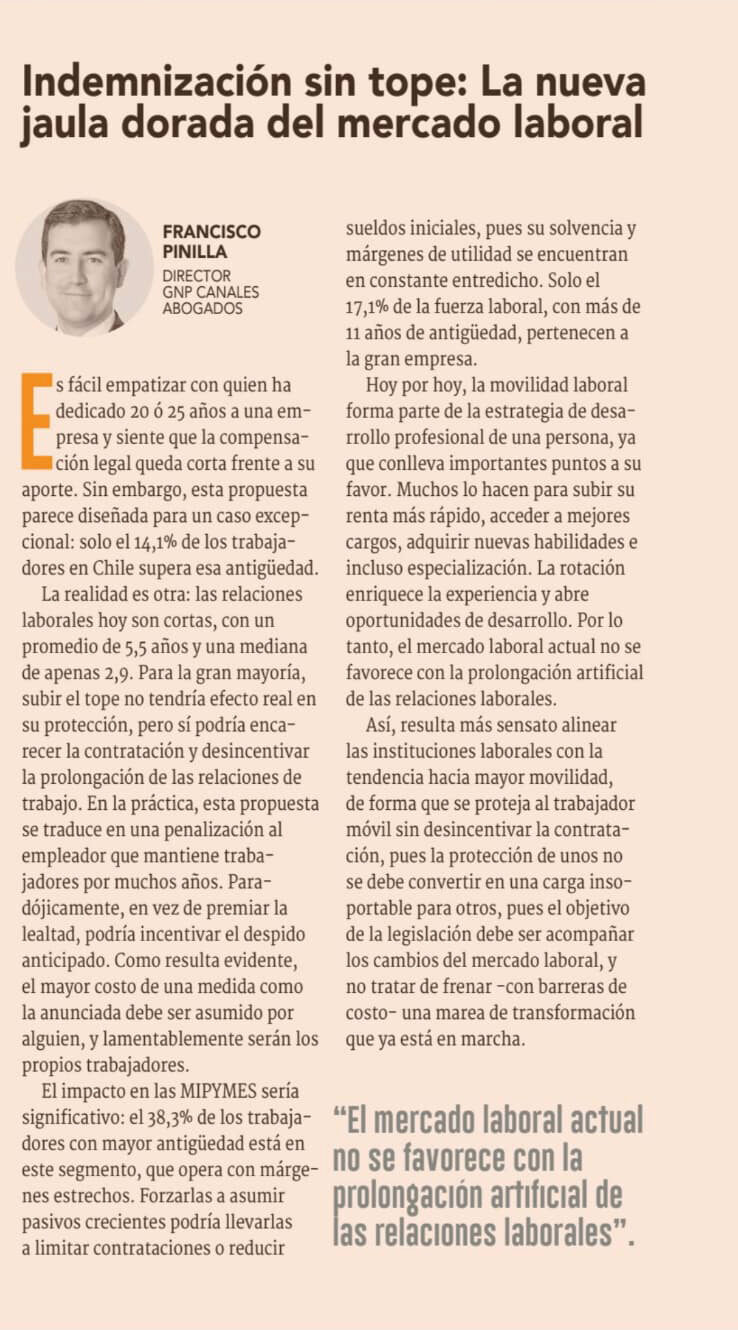 Nuestro asociado, Francisco Pinilla, abordó las implicancias que tendría eliminar el tope por años de indemnización. A su juicio, lejos de fortalecer la estabilidad laboral, esta medida podría encarecer la contratación, desincentivar relaciones de largo plazo y terminar afectando especialmente a las PYMES. “Para la gran mayoría, subir el tope no tendría efecto real en su protección, pero sí podría encarecer la contratación y desincentivar la prolongación de las relaciones de trabajo. En la práctica, esta propuesta se traduce en una penalización al empleador que mantiene trabajadores por muchos años. Paradójicamente, en vez de premiar la lealtad, podría incentivar el despido anticipado”, reflexiona en ella.