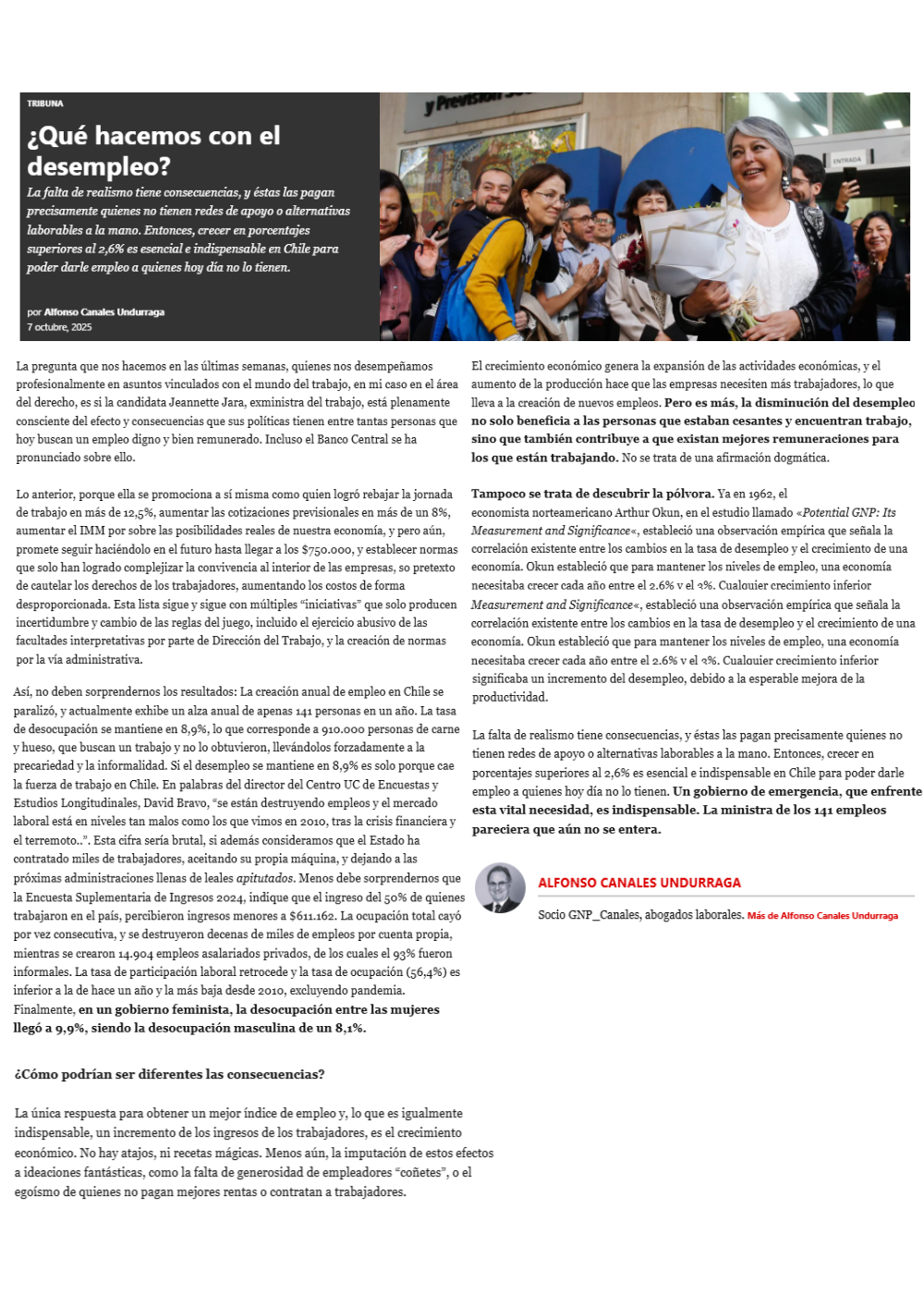 Nuestro socio en GNP Canales, Alfonso Canales Undurraga, publicó recientemente una columna de opinión en El Líbero, titulada “¿Qué hacemos con el desempleo?”, en la que analiza en profundidad los desafíos que enfrenta el mercado laboral chileno, especialmente en un contexto marcado por cifras preocupantes de desempleo y precarización del trabajo.